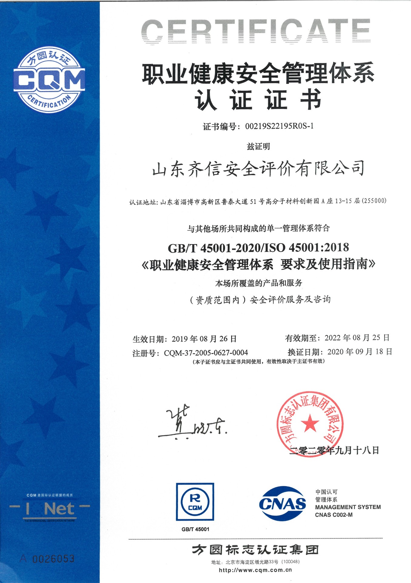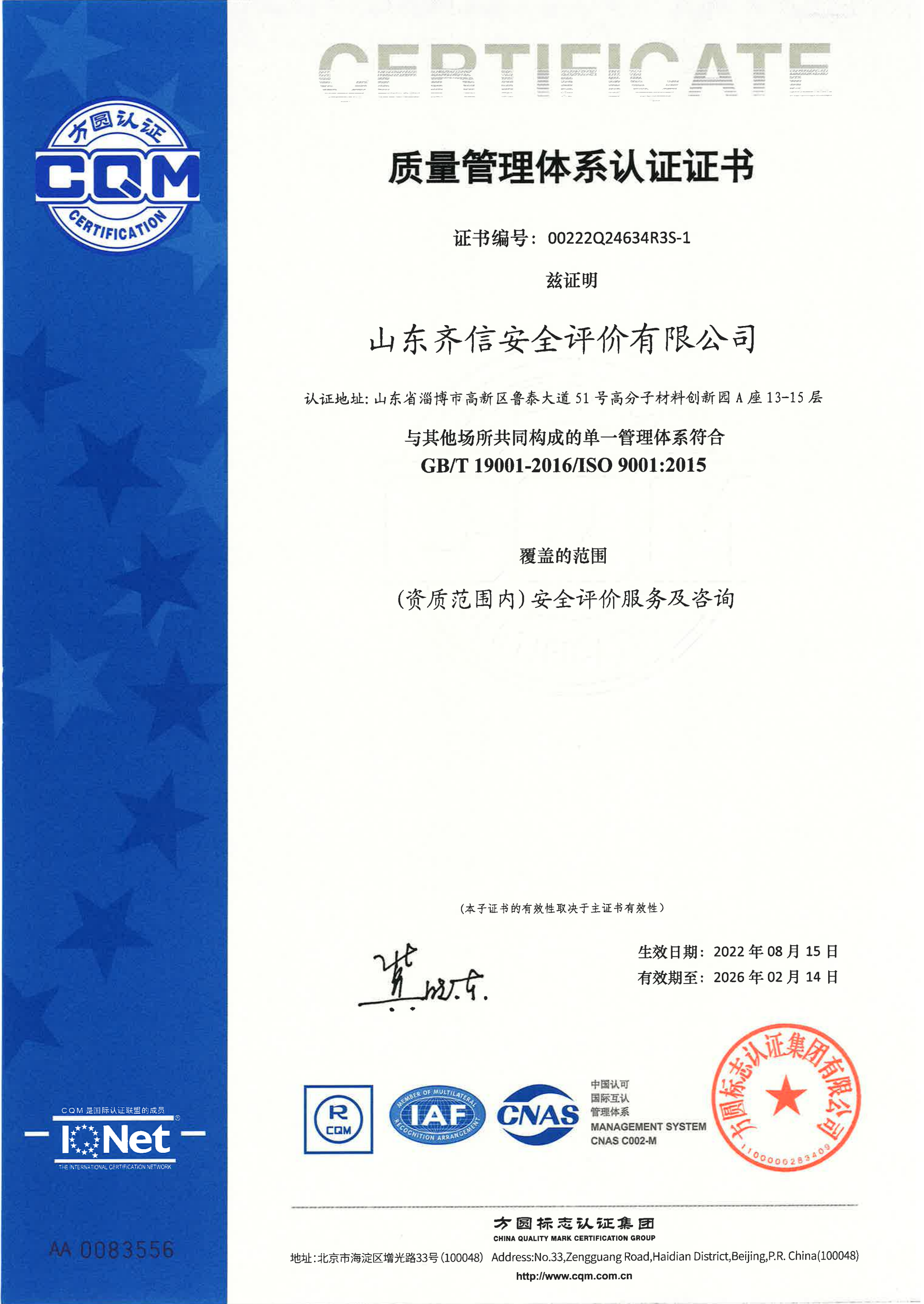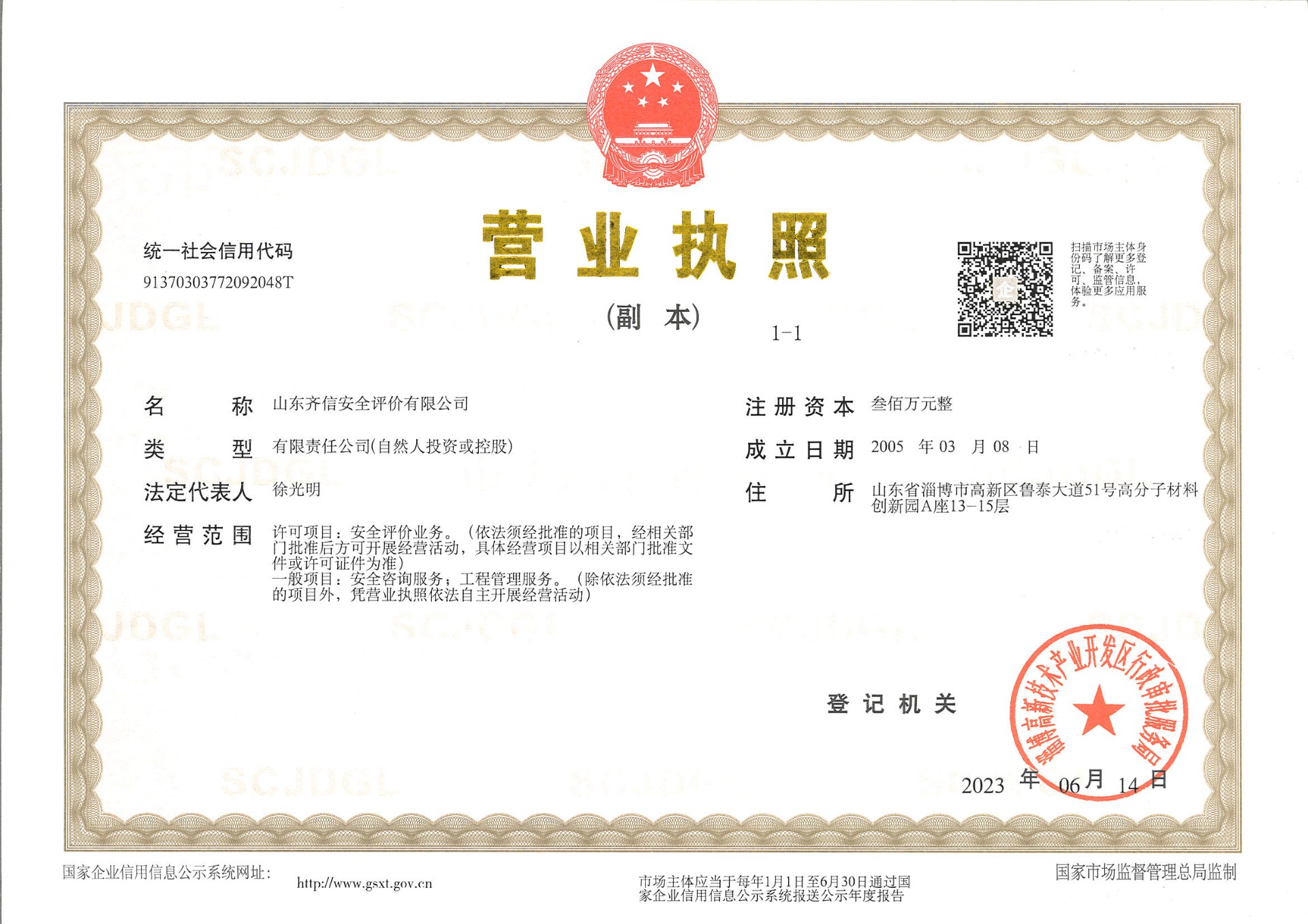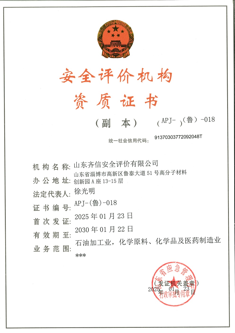 山東齊信安全評價有限公司成立于2005年3月,注冊資本300萬元人民幣,固定資產(chǎn)總值804.8728萬元。法定代表人徐光明,注冊地址及辦公地址位于淄博高新區(qū)魯泰大道51號高分子材料創(chuàng)新園A座13-15樓。2005年9月取得安全評價機構乙級資質(zhì)。自國家應急部1號令實施以來,公司于2020年1月15日取得新安全評價資質(zhì),業(yè)務范圍包括:陸上油氣管道運輸業(yè);石油加工業(yè),化學原料、化學品及醫(yī)藥制造業(yè);金屬冶煉。2018年12月21日取得安全生產(chǎn)標準化二級評審單位,評審范圍:危險化學品、紡織、建材、輕工、冶金、機械。 公司現(xiàn)有人員41人,其中專職安全評價師37人,注冊安全工程師26人,研究員1人、碩士5人、雙學士1人,山東省安全專家?guī)鞂<?人、教授級高工1人,高級工程師8人、工程師22人,專職危險化學品標準化評審員、工商貿(mào)標準化評審員30人,本科以上學
